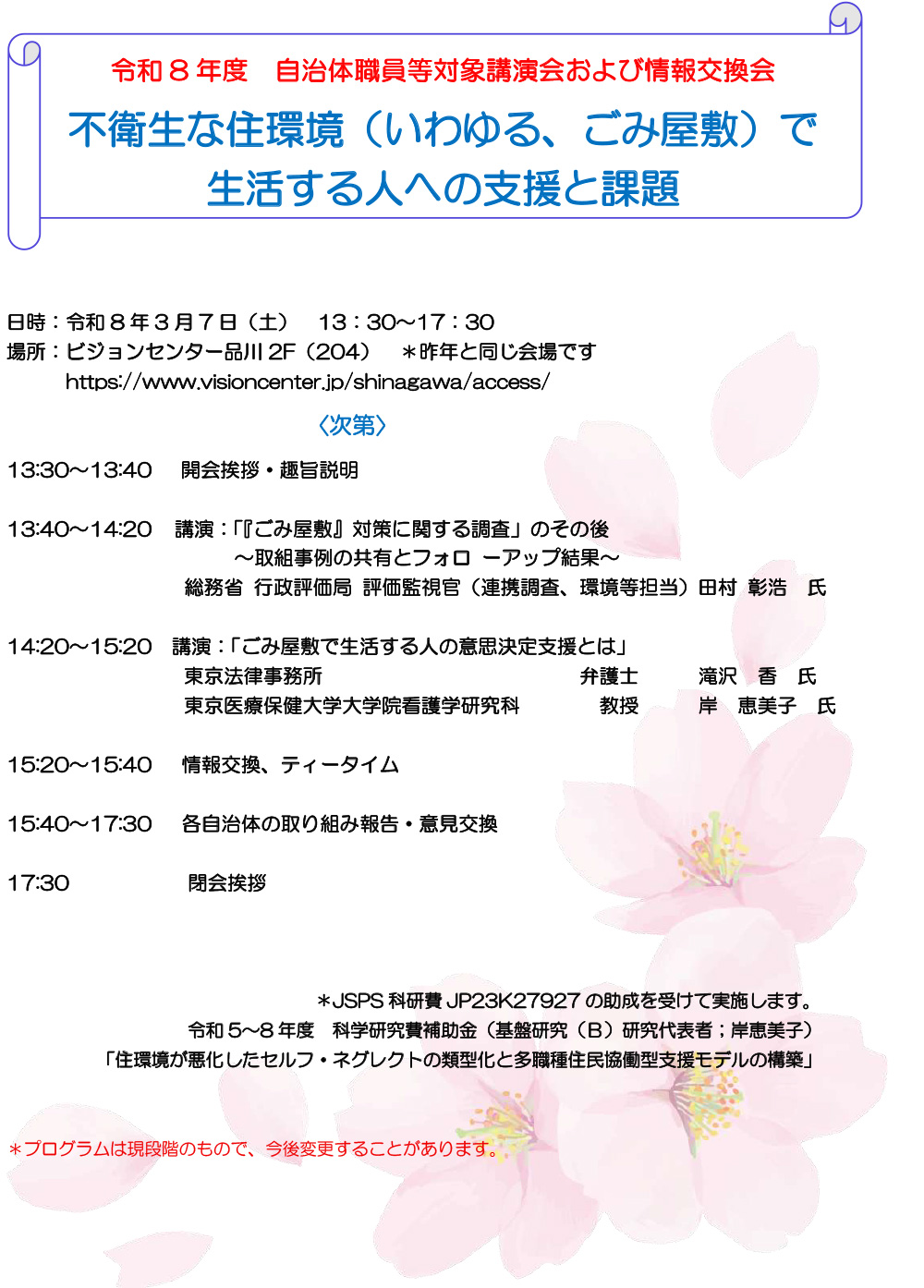 令和8年3月7日(土)13:30から17:30まで、ビジョンセンター品川にて、「自治体講演会および情報交流会〜不衛生な住環境(いわゆる、ゴミ屋敷)で生活する人への支援と課題」を開催いたします。多くの方のご参加をお待ちしております。参加希望される方は、下記より申込書をダウンロードして、申込書に記載してあるメールアドレスにご送付ください。